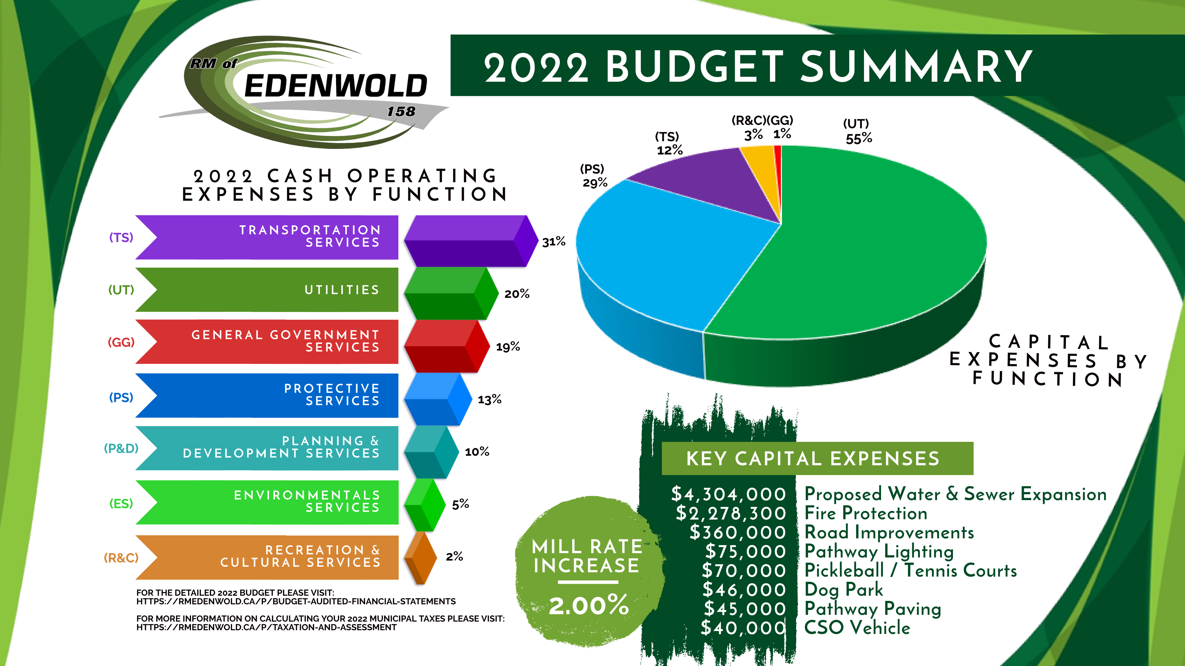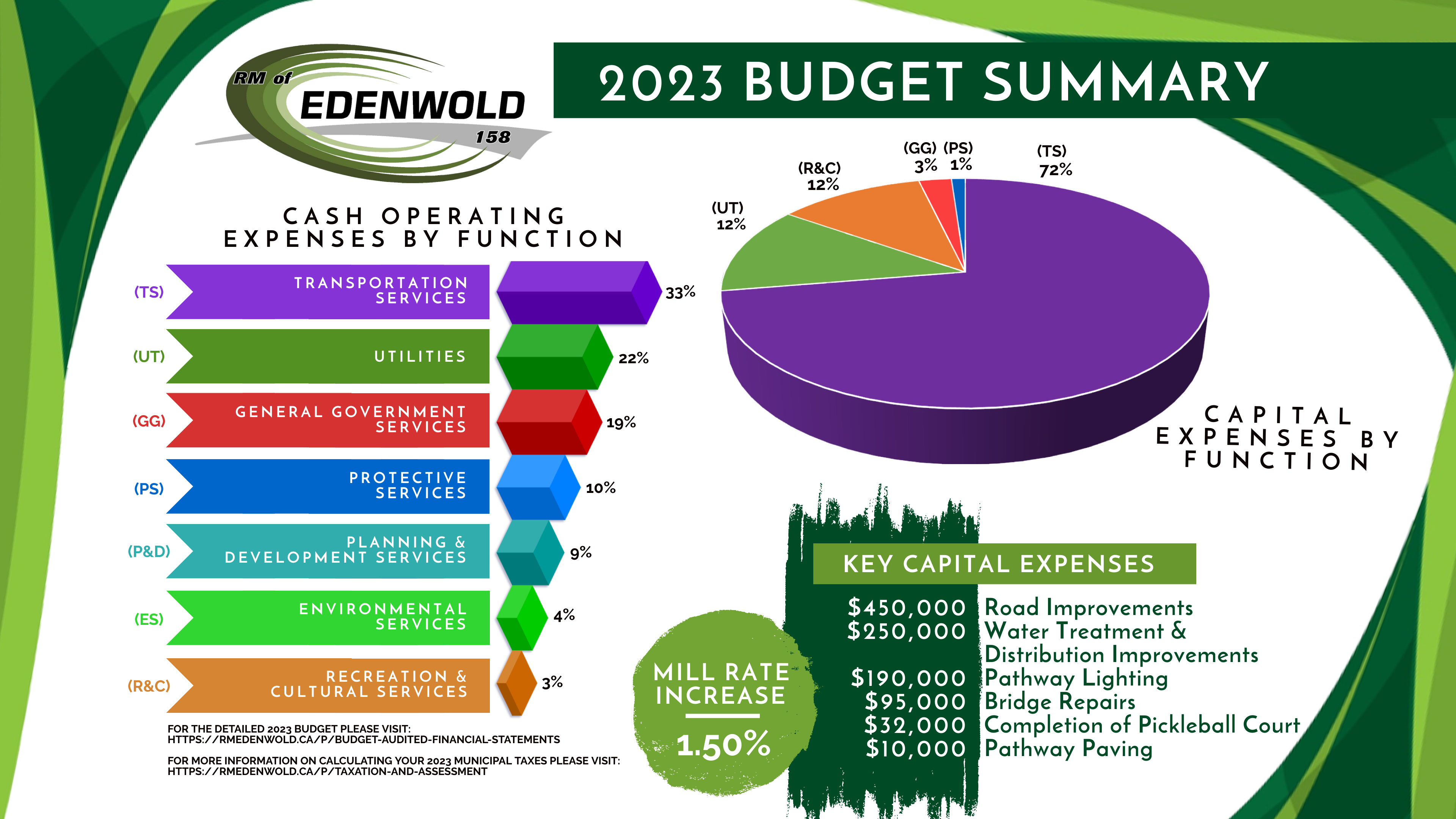 The municipal budget predicts how much money the RM of Edenwold will earn in revenue each year and how much the RM expects to spend on expenses. The budget accounts for property taxes, public works operations, utilities, grants, wages and benefits, technology and software, and other municipal costs. The budget is designed to ensure a high level of service and continual improvements to quality-of-life for RM residents and businesses. To view a municipal budget, please click on the links below: